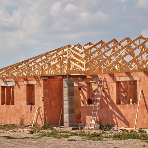 Zastřešení dvou objektů v Jenišovicích je provedeno naší standardní konstrukcí – vazníky z hoblovaného řeziva S4S. Jedna věc však tuto konstrukci od těch běžných odlišuje, a to použití vzepjatých vazníků nad hlavním obytným prostorem RD. Spodní pasy vazníků kopírují sklon střechy, takže se valbový tvar střechy propíše i do dokončeného interiéru. Celkově bylo na zakázku použito 10,5 m3 řeziva, 250 kg styčníkových desek, výroba nám zabrala přibližně dva dny a montáž na stavbě byla dokončena za zhruba osm dní.