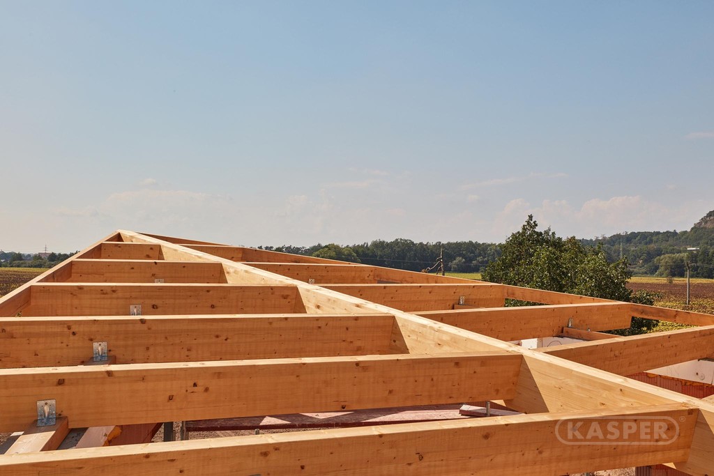 Jedná se o zastřešení rodinného domu o dvou výškových úrovních. Přízemní část domu je s pultovou střechou o sklonu 10°. V této části byla použita vazníková konstrukce z hoblovaného řeziva S4S. Střechu na patrové části domu tvoří průnik dvou obecně položených rovin – střecha má pouze jednu vodorovnou okapní hranu a jedno nároží. Vzhledem k tvaru konstrukce zde bylo rozhodnuto o použití masivních BSH profilů. V nároží probíhá hlavní nosná vaznice, do které jsou z obou stran kotveny krokve jednotlivých střešních rovin. Na stavbu bylo použito celkově 9,8 m3 řeziva.