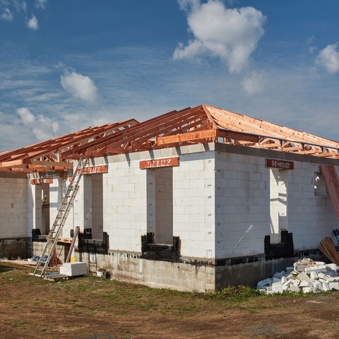 Zastřešení rodinného domu ve Straškově je specifické užitím pohledových vazníků typu BSB v kombinaci se standardními nepohledovými vazníky se styčníkovou deskou. Vazníky typu BSB (Blumer-systém-binder) se vyznačují skrytými spoji. Ocelové plechy jsou vkládány do připravené drážky a následně spojovány samovrtnými kolíky do předvrtaných otvorů ve dřevě. U tohoto rodinného domu jsou umístěny 3 BSB vazníky nad obývacím pokojem pro vytvoření otevřeného prostoru. Z prvního vazníku je navíc zavěšena pochozí galerie.